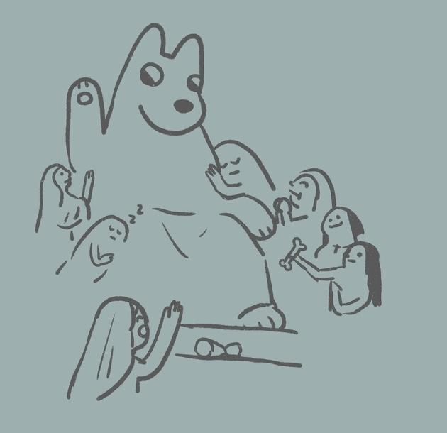 In the original artwork the dog's hand is not touching the head of the figure in the background.