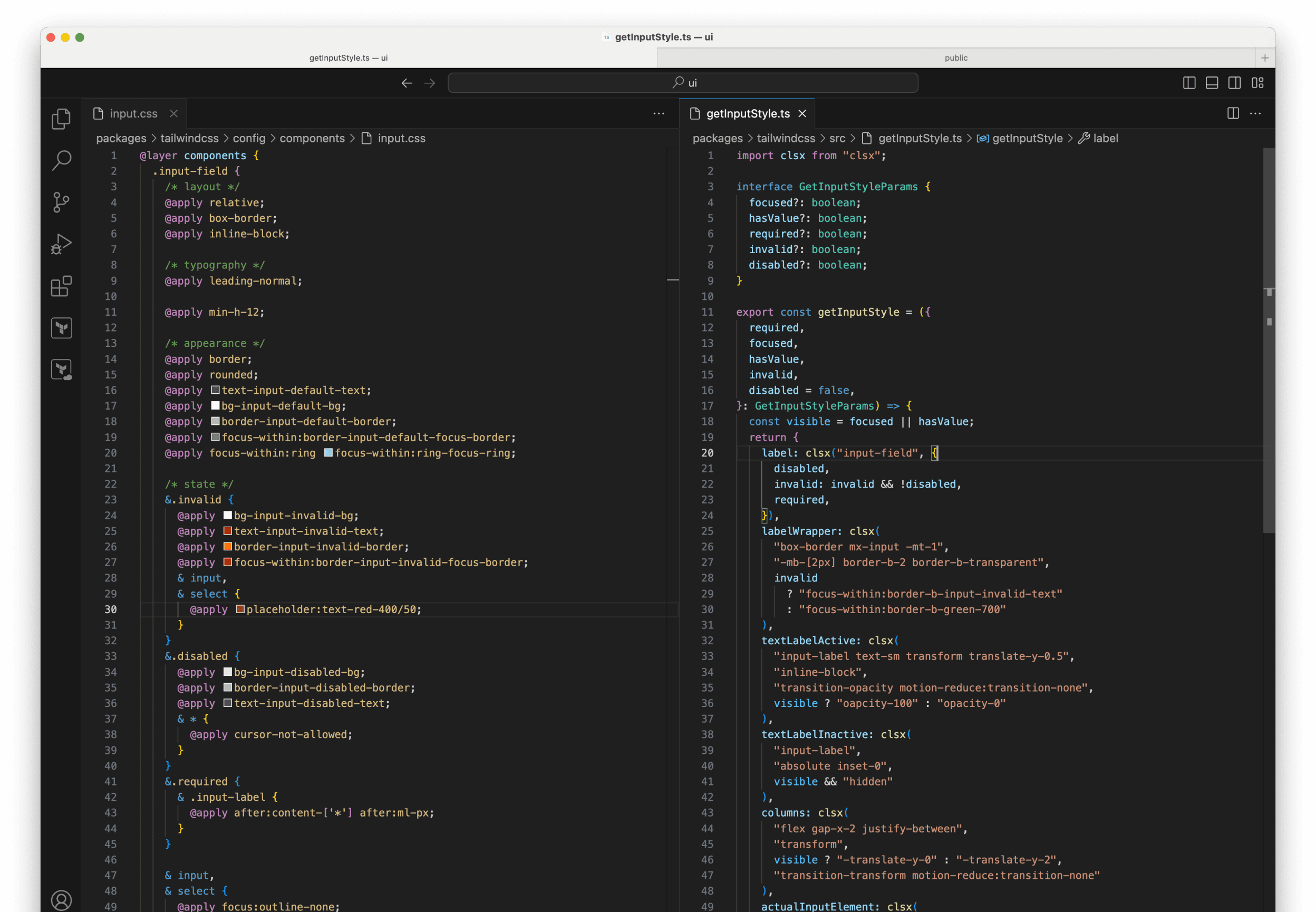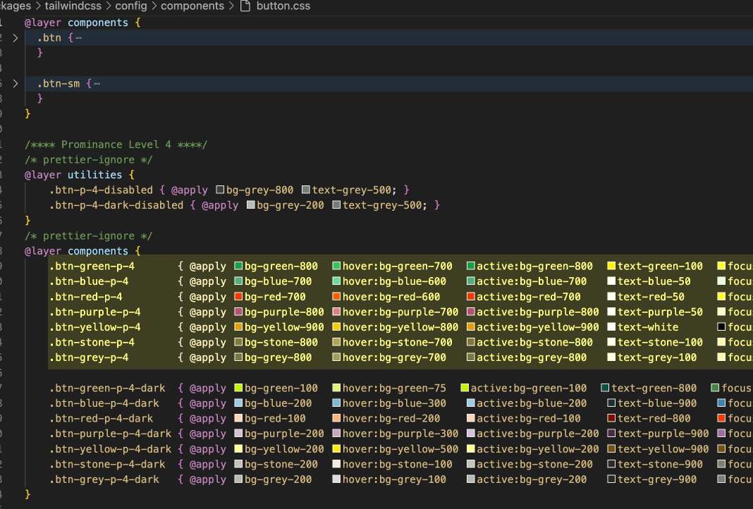 The reason why we still use a bunch of Tailwind-specific syntax when we supposedly can just use vanilla CSS is to benefit from the state modifiers from Tailwind. I've tried a few different vanilla approaches like CSS Variables or just plain straight CSS, but eventually I realized with @apply the code is the easiest to author - each color token is arranged like the table structure we have in the Figma file.